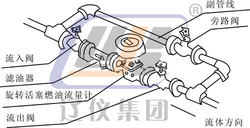 該流量計(jì)必須與濾油器配套使用而用水平安裝(即表盤(pán)在水平位置),安裝時(shí)要注意流體流向,應(yīng)符合流量計(jì)主體上的箭頭所示方向。為了使工藝設(shè)備不停止運(yùn)轉(zhuǎn)即可檢修流量計(jì)與清洗濾油器,應(yīng)裝設(shè)副管線,可參照下面的安裝示意圖。