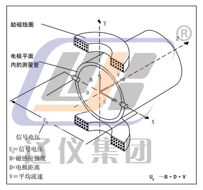 電磁流量計所依據(jù)的基本原理是法拉第電磁感應(yīng)定律,導(dǎo)體在磁場中做切割磁力線運動時,導(dǎo)體內(nèi)將產(chǎn)生感應(yīng)電動勢。將該原理應(yīng)用于測量管內(nèi)流動的導(dǎo)電液體,并且流體流動的方向與磁場方向垂直(見圖)。流體中產(chǎn)生的感應(yīng)電動勢被位于管子徑向兩端的一對電極檢測到,該感應(yīng)電動勢被位于管子徑向兩端的一對電極檢測到,該感應(yīng)電動勢(信號電壓)UE與磁感應(yīng)強度B,電極間距離D和平均流速V成正比。因磁感強度B和電極距離D和平均流速V成正比。因磁感應(yīng)強度B和電極距離D是常數(shù),所以感應(yīng)電動勢(信號電壓)UE與平均流速V成正比,而體積流量又與平均流速V成正比,所以體積流量與感應(yīng)信號電壓成正比。在信號轉(zhuǎn)換器中,該感應(yīng)信號電壓被轉(zhuǎn)換成體積流量,同時轉(zhuǎn)換成可編程的模擬和數(shù)字信號輸出。