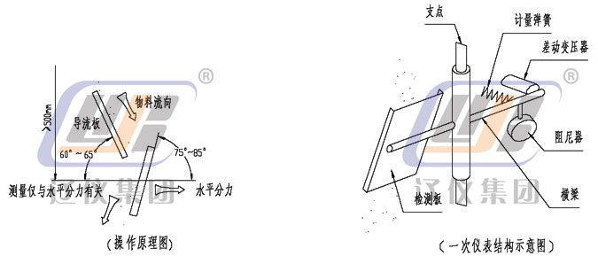 干燥的散裝固體物料自由落體沖擊到傳感檢測板(沖板)上后,傳感檢測板產(chǎn)生機械偏移。然后散裝物料流連續(xù)而無阻礙的通過。即:由于沖擊力與傳感檢測板具有一定角度,故該力分解成一個水平分力和一個垂直分力。垂直分力由變送器的機械結(jié)構(gòu)克服而不起作用,而水平分力有一個差動傳感器(線性可調(diào)差動變送器),這個信號經(jīng)與之相連的積算儀檢測和處理,得出瞬時流量和累積流量。
